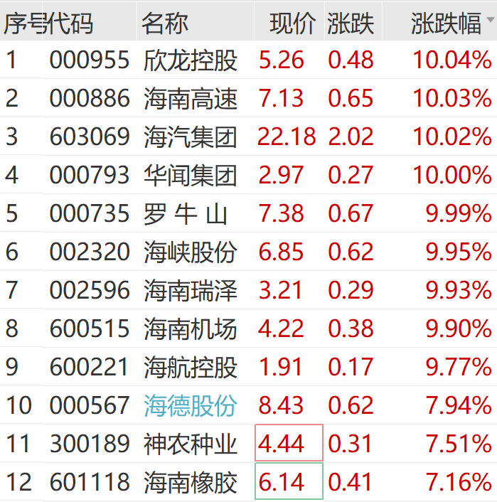 海南自贸港概念同样表现抢眼,欣龙控股、海南高速、罗牛山、海南瑞泽、海航控股等多只个股涨停。
