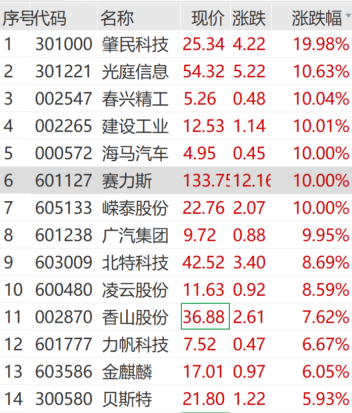 此外,上午汽车板块整体表现良好,赛力斯冲上涨停,总市值达到2019亿元。肇民科技20CM涨停,春兴精工、海马汽车、嵘泰股份等多只个股亦纷纷涨停。