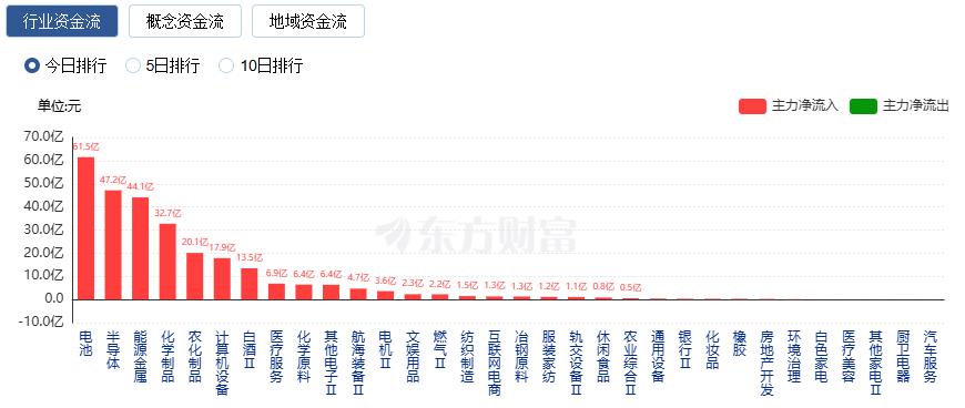 行业资金方面,截至收盘,电池、半导体、能源金属等净流入排名靠前,其中电池净流入61.51亿。