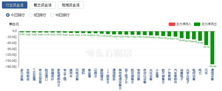 净流出方面,通信设备、元件、电力等净流出排名靠前,其中通信设备净流出166.4亿元。