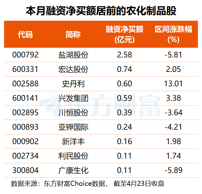 本周化肥板块涨跌互现,史丹利、*ST辉丰、金正大、农大科技、赤天化等涨幅居前,东方财富Choice数据显示,本周前四个交易日,共有17只农化制品股获得融资净买入,其中,盐湖股份获杠杆资金大幅加仓2.58亿元,宏达股份获抢筹0.74亿元,史丹利、兴发集团融资净买额均近0.6亿元,川恒股份亦获约0.4亿元融资净买入。