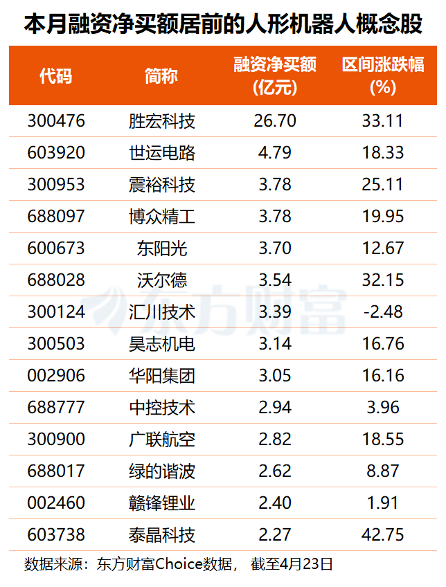 从资金角度看,东方财富Choice数据显示,本月共有26只人形机器人概念股获得超亿元融资净买入,其中,胜宏科技获杠杆资金大幅加仓26.70亿元,世运电路获融资客抢筹4.79亿元,震裕科技、博众精工、沃尔德、汇川技术、昊志机电等7股融资净买额均在3亿元以上。