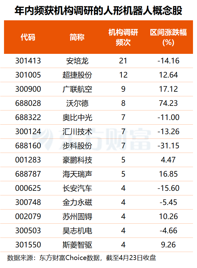 机构关注度方面,今年以来,共有27只人形机器人概念股获得3次及以上机构调研,其中,安培龙机构关注度最高,公司年内已获21次调研,超捷股份、广联航空、沃尔德被调研次数分列二至四位,奥比中光、汇川技术、步科股份的机构调研次数均为7次。