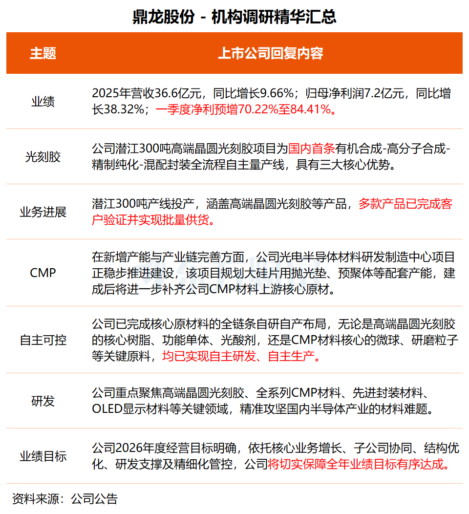 在调研中,鼎龙股份表示,公司潜江300吨产线投产,涵盖高端晶圆光刻胶等产品,多款产品已完成客户验证并实现批量供货。