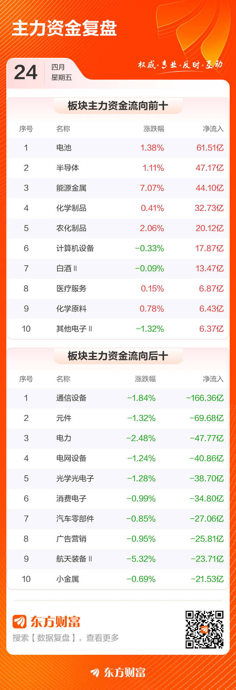 4月24日,沪指跌0.33%,深成指跌0.69%,创业板指跌1.41%。两市成交额2.64万亿,较上个交易日缩量1626亿。数据显示,今日大盘主力资金净流出574.03亿。电池、半导体、能源金属等板块主力资金流入排名居前,其中电池净流入