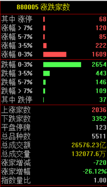 两市共2036只个股上涨,68只个股涨停,3352只个股下跌。