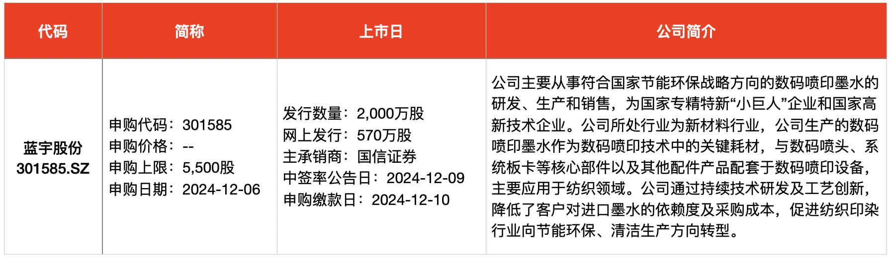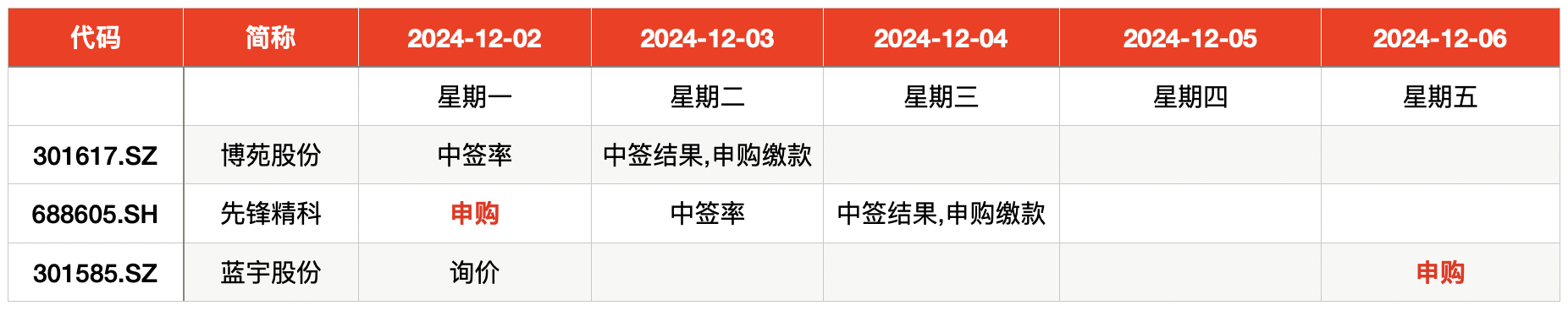 本周新股申购市场迎来亮点,国产半导体零部件领域的先锋精科成为焦点。据澎湃新闻统计,本周(12月2日-12月6日)共有两只新股安排网上申购,分别是先锋精科(688605.SH)和蓝宇股份(301585.SZ)。