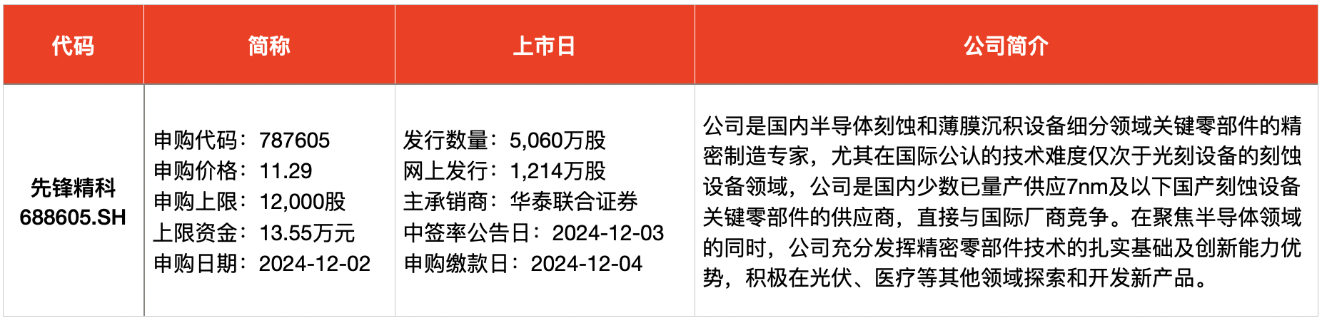 本周新股申购亮点:国产半导体零部件龙头先锋精科来袭
