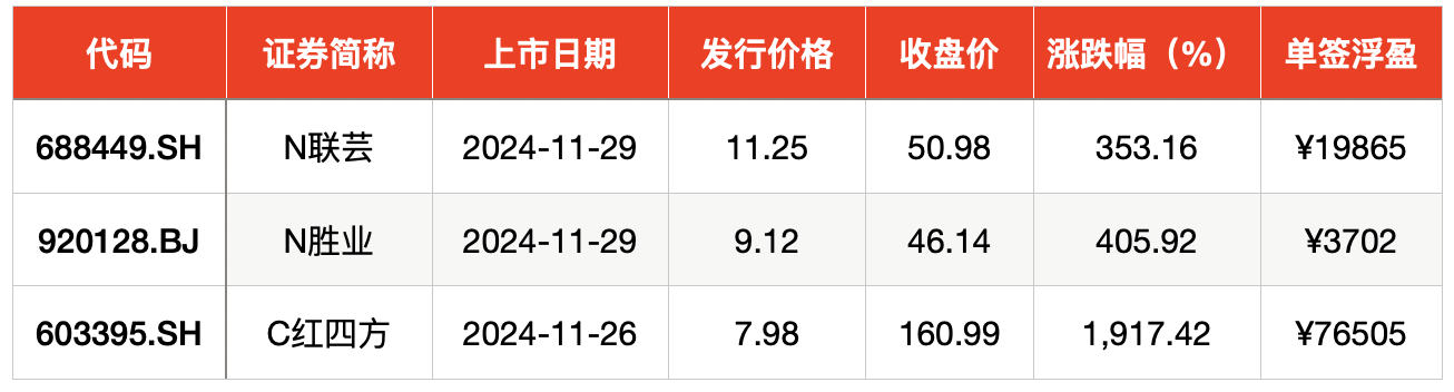 本周暂无新股上市计划。回顾上周,共有三只新股上市,包括红四方、联芸科技和胜业电气。其中,红四方上市首日股价大涨,投资者中一签最高浮盈可达90010元。