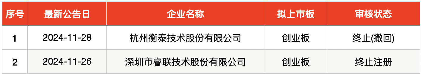同时,上周共有两家企业终止IPO,分别是杭州衡泰技术股份有限公司和深圳市睿联技术股份有限公司。