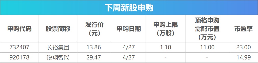 数据显示,下周将有2只新股发行,其中,沪市主板有1只,北交所有1只。4月27日发行的是长裕集团、锐翔智能。