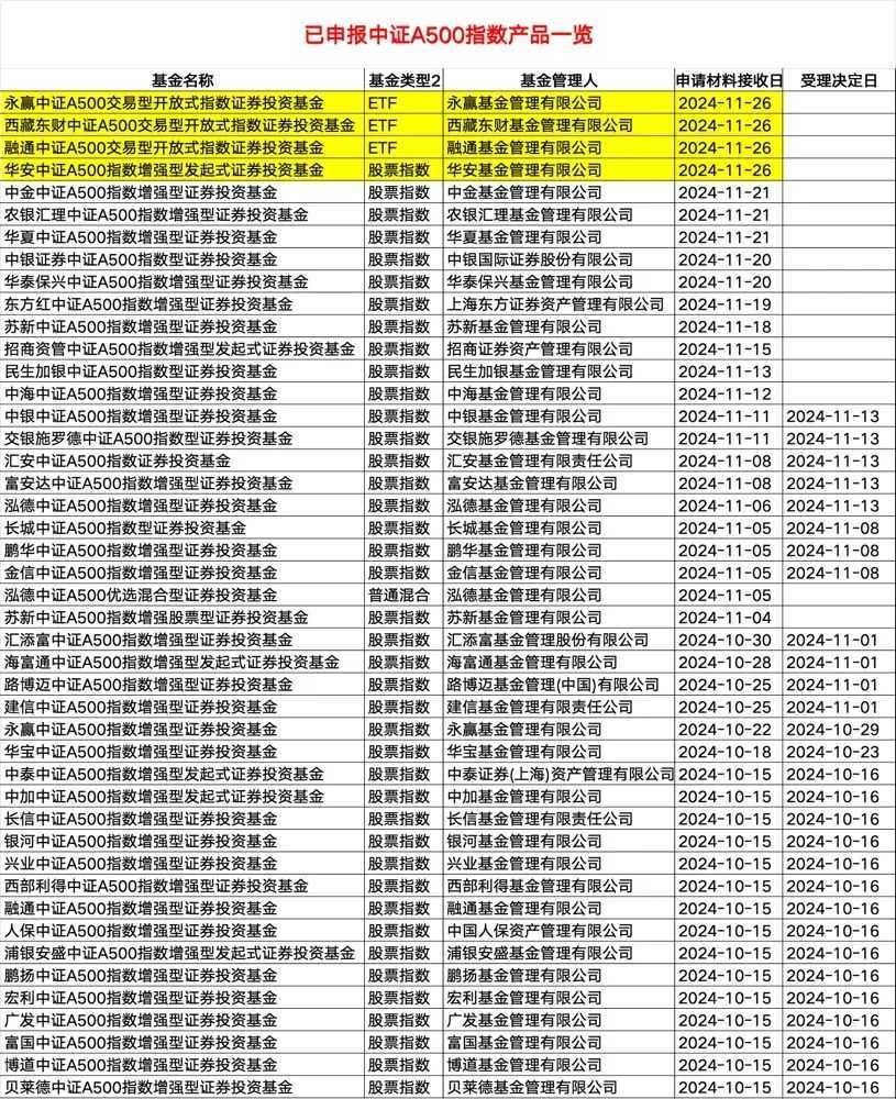 中证A500指数产品在今年基金市场中大放异彩,吸引了众多基金公司的积极参与。11月26日,永赢基金、西藏东财基金、融通基金及华安基金等四家机构纷纷向证监会递交了中证A500指数产品的募集申请,其中三家申报了中证A500 ETF,华安基金则上报了中证A500指数增强基金。