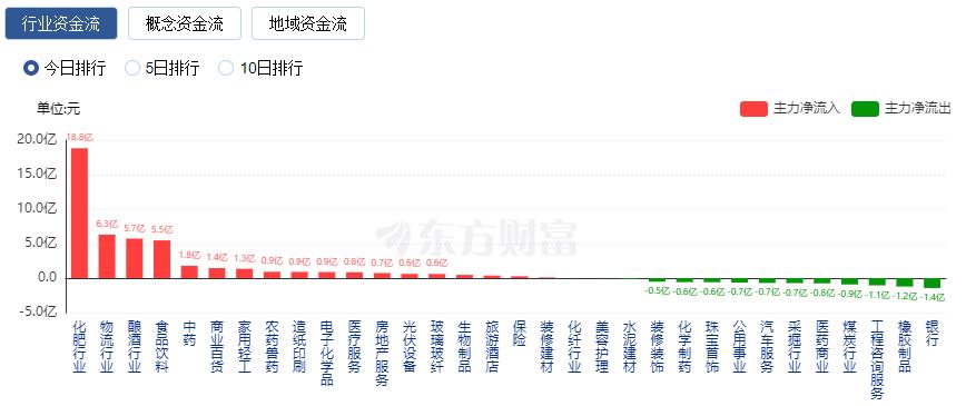行业资金流向方面,化肥行业、物流行业、酿酒行业等资金净流入排名靠前,其中化肥行业净流入高达18.83亿。而软件开发、电池、互联网服务等行业则资金净流出排名靠前,软件开发行业净流出更是达到66.05亿元。