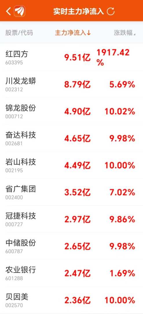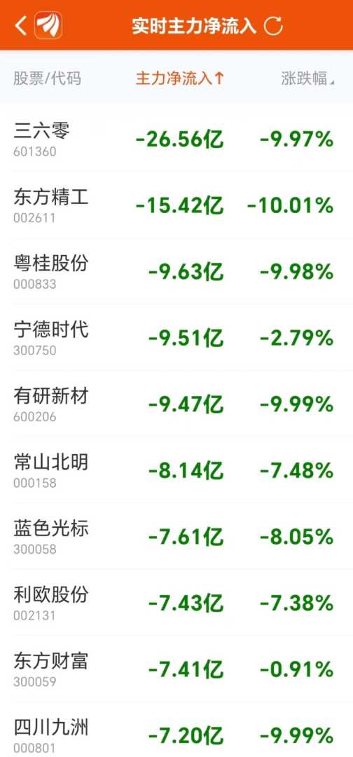 东方财富Choice数据显示,11月26日主力净买入前十大个股中,红四方以9.51亿元净买入额排名第一,川发龙蟒以8.79亿元紧随其后。而在主力净卖出方面,三六零以26.56亿元的净卖出额位居榜首,东方精工则以15.42亿元排名第二。