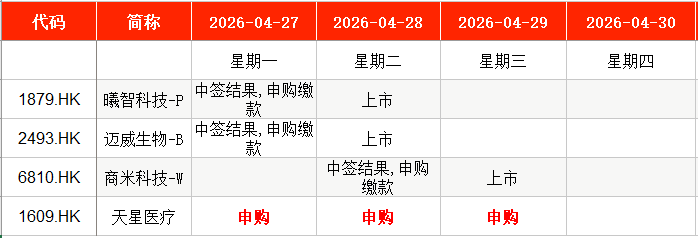 港股方面,Wind数据显示,本周(4月27日至4月30日)有1只新股安排申购。天星医疗(01609.HK)将在本周一至本周三申购。