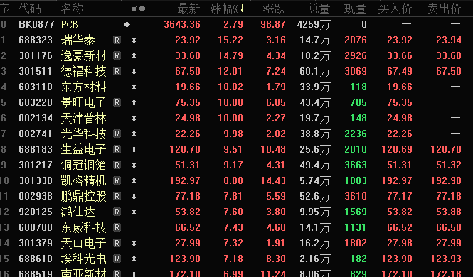 4月27日,A股PCB板块集体上涨,景旺电子、天津普林涨停,方邦股份、逸豪新材分别上涨16.28%、14.79%,其他还有生益电子、鹏鼎控股、南亚新材、深南电路等上涨超过6%。