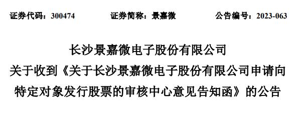 昨日,长沙景嘉微电子股份有限公司(股票代码:300474.SZ)正式对外公告,公司于2023年8月2日顺利接获深圳证券交易所上市审核中心下发的《关于长沙景嘉微电子股份有限公司申请向特定对象发行股票的审核中心意见告知函》。经深交所发行上市审核机构的细致审核,公司提交的向特定对象发行股票的申请文件已满足发行条件、上市条件及信息披露的各项标准,后续深交所将依照既定流程向中国证监会报送相关注册材料。