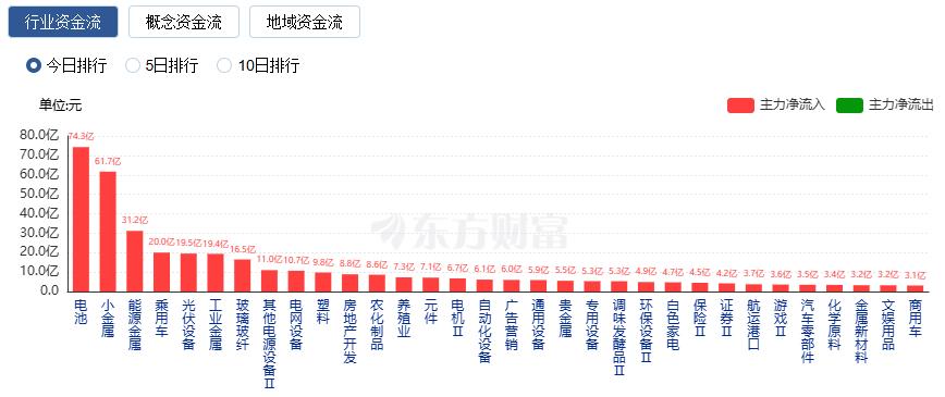 行业资金方面,截至收盘,电池、小金属、能源金属等净流入排名靠前,其中电池净流入74.27亿。