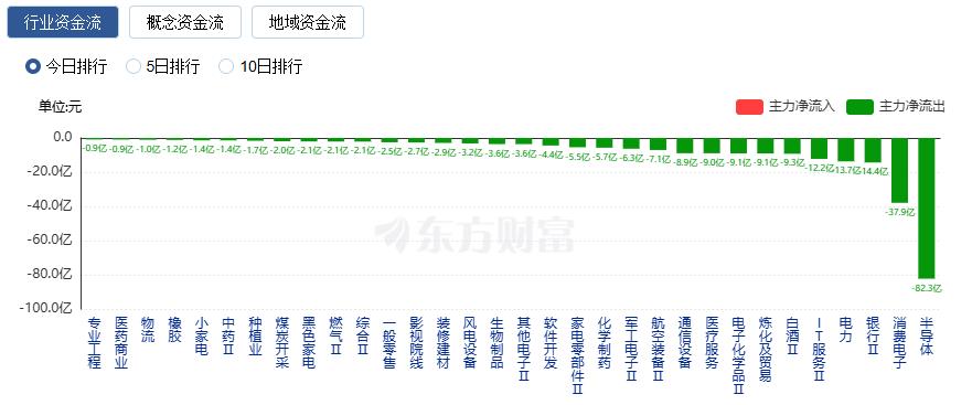 净流出方面,半导体、消费电子、银行等净流出排名靠前,其中半导体净流出82.29亿元。