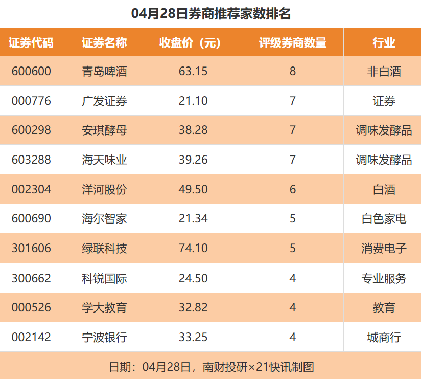 从券商推荐家数来看,4月28日有331家上市公司得到券商推荐,其中青岛啤酒获得8家推荐,广发证券、安琪酵母、海天味业获得7家推荐。