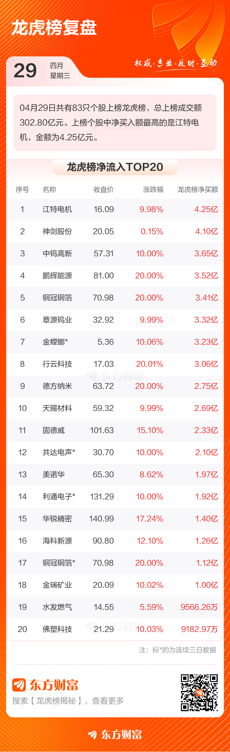 4月29日共有83只个股上榜龙虎榜,总上榜成交额302.80亿元。上榜个股中净买入额最高的是江特电机,金额为4.25亿元。