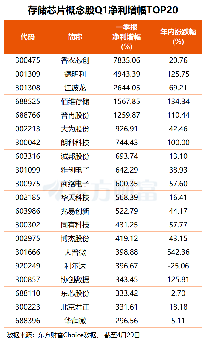 年初至今,约八成存储芯片概念股均录得股价上涨,除了近日上市的大普微、红板科技,科翔股份、佰维存储、协创数据、德明利等多股股价均成功翻倍。