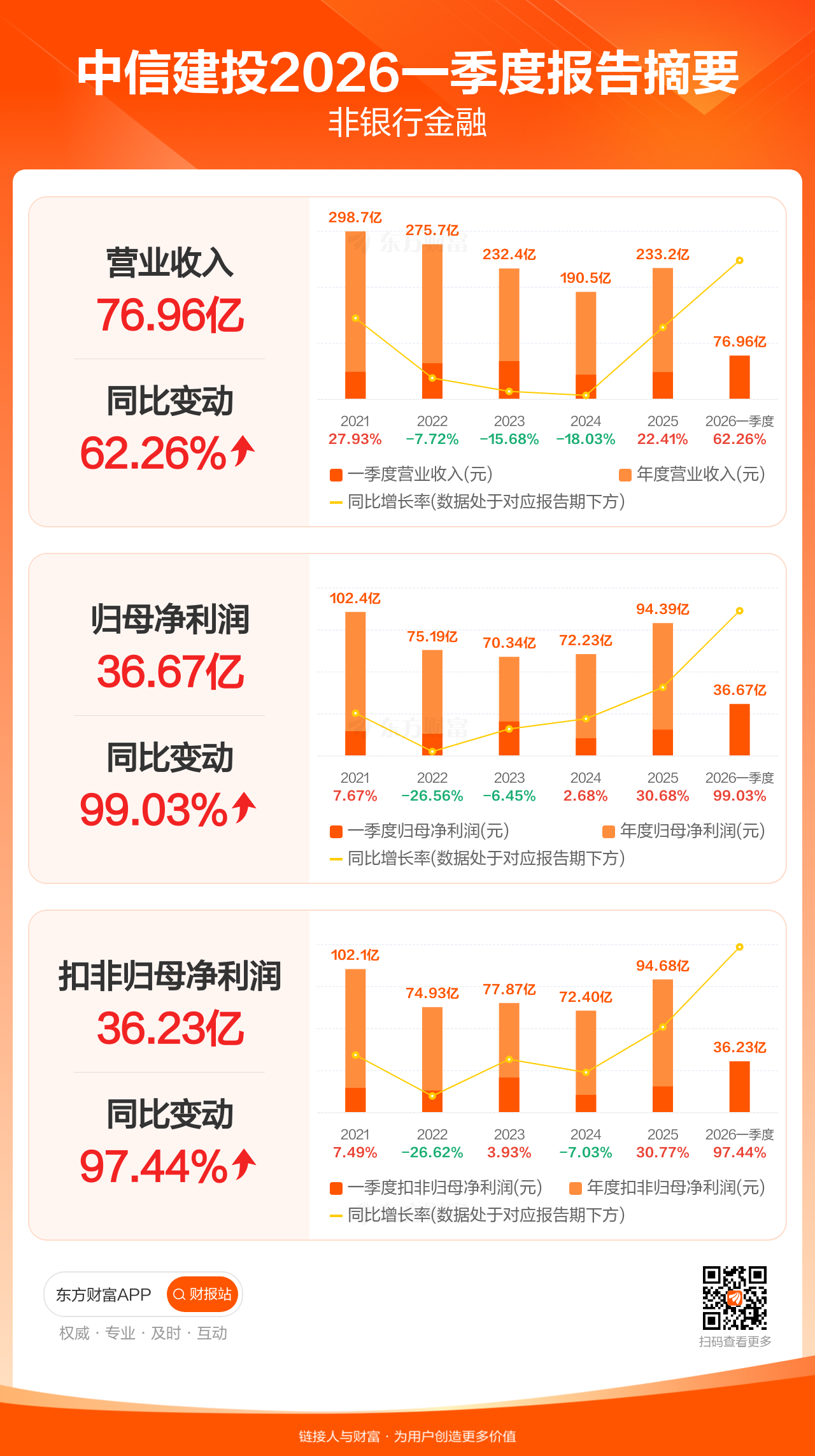 中信建投4月30日发布2026年一季报显示,公司一季度实现营业收入76.96亿元,同比增长62.26%;归母净利润36.67亿元,同比增长99.03%;扣非归母净利润36.23亿元,同比增长97.44%。