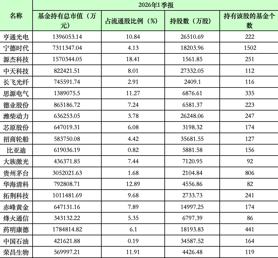 截至一季度末,主动偏股基金持有源杰科技、天孚通信、亨通光电的总市值分别为157.03亿元、153.84亿元、139.61亿元。这3只个股成为主动偏股基金第11、第12、第15大重仓股。
