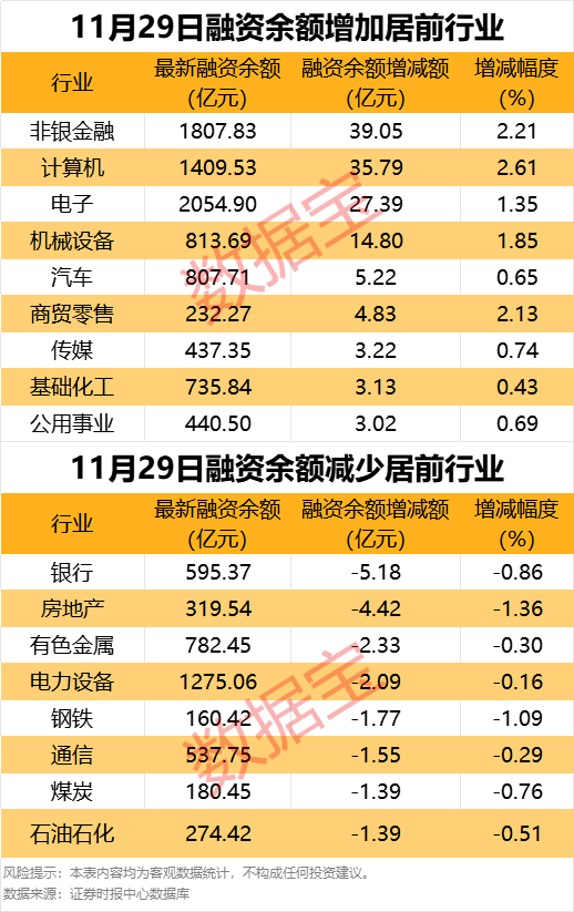 截至11月29日,市场融资余额总计达到1.83万亿元,较前一个交易日增加55.27亿元,标志着融资余额已连续三个交易日稳步增长,累计增幅高达124.49亿元。在此期间,申万所属的31个行业中,有19个行业融资余额实现增长,其中,非银金融行业融资余额增长最为显著,增加39.05亿元,计算机、电子等行业紧随其后;而银行、房地产等行业融资余额则有所减少。