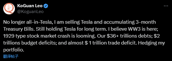 特斯拉第三大股东廖凯原表示正在削减对特斯拉的持仓,并将资金投入短期美国国库券,此举是为了对冲投资组合,同时他担忧第三次世界大战已经到来,股市可能面临崩盘。