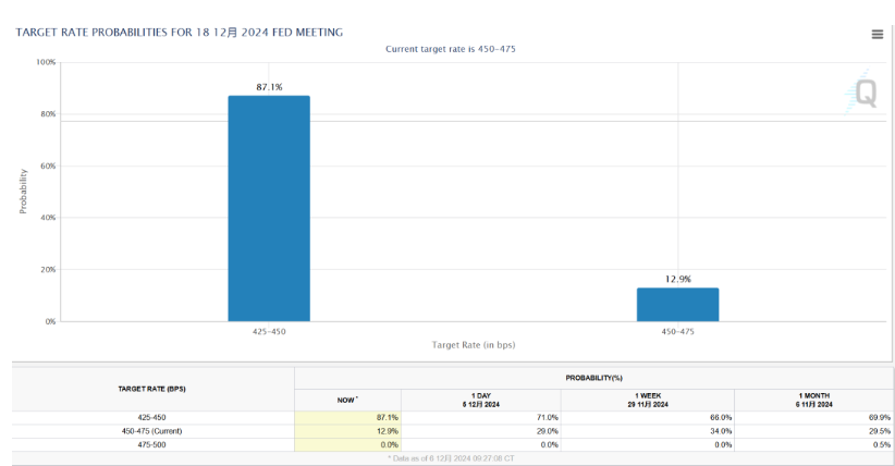 市场分析认为,这份就业报告对美联储未来的降息决策至关重要。就业数据公布后,市场降息预期升温,12月18日美联储降息25个基点的概率已超过87%。