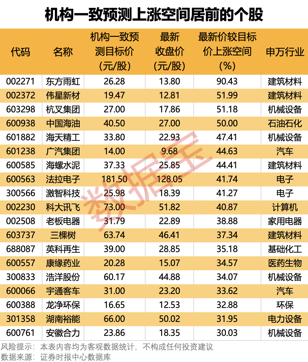 此外,本周机构评级的个股中,19股最新收盘价较机构一致预测目标价上涨空间超30%,其中东方雨虹上涨空间超90%,伟星新材、杭叉集团、中国海油也均达50%及以上。