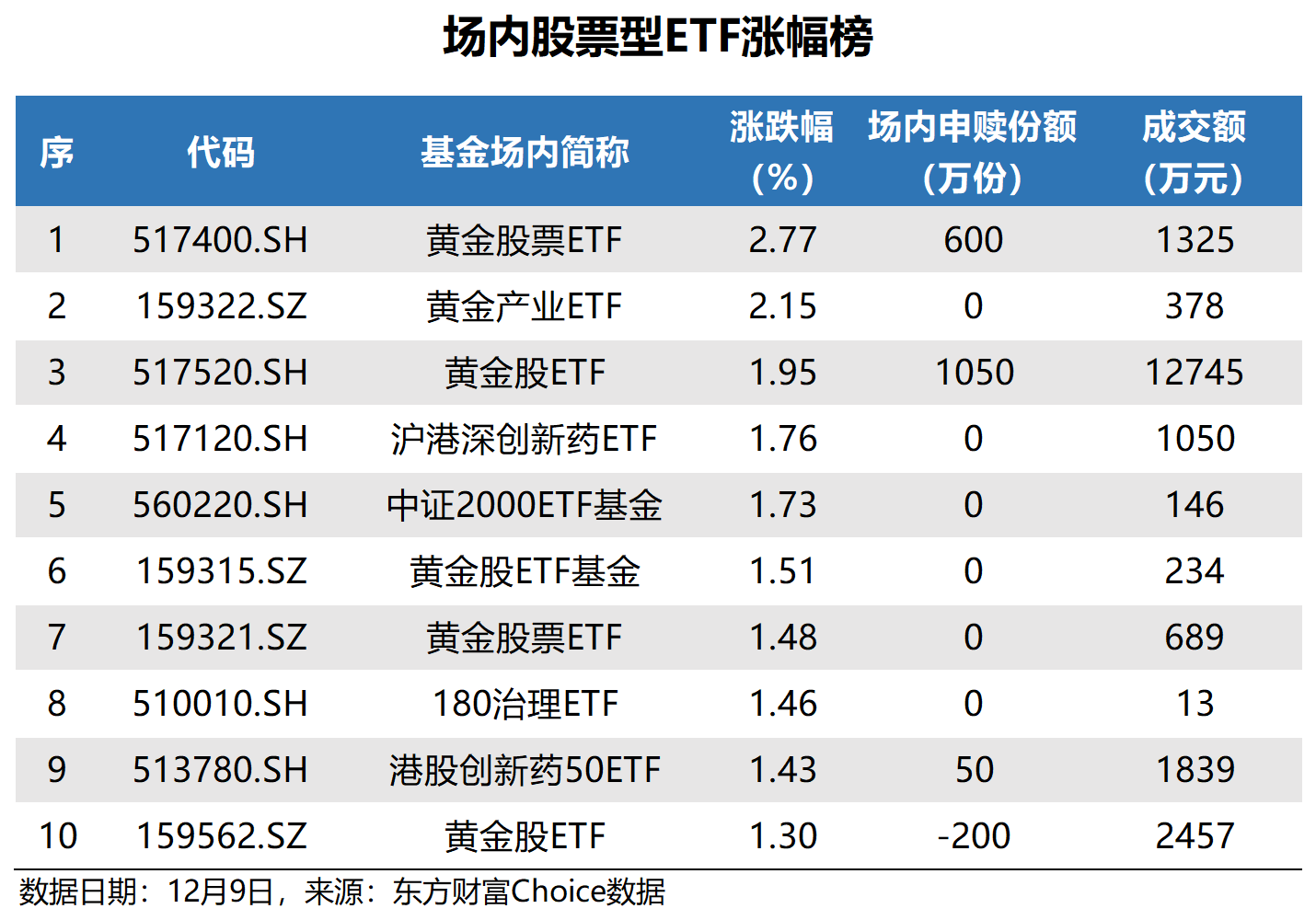 昨日(12月9日),东方财富Choice数据显示,场内股票型ETF整体呈现净申购态势,共计净申购26.07亿份。具体来看,沪市股票型ETF净申购15.58亿份,深市股票型ETF净申购10.49亿份。然而,以最新净值计算,市场整体却呈现净赎回状态,赎回金额为6.11亿元。