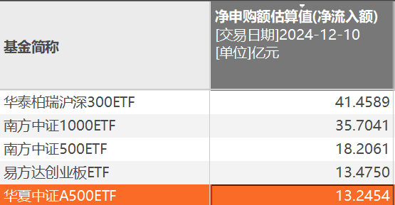 12月10日,市场迎来大规模资金流入,股票型ETF当日净申购额高达290.33亿元,这一数字创下了近两个月以来的新高。具体来看,宽基ETF成为资金追捧的热点,华泰柏瑞沪深300ETF和南方中证1000ETF分别吸引了41.46亿元和35.7亿元的净申购额,而南方中证500ETF、易方达创业板ETF、华夏中证A500ETF的净申购额也都超过了13亿元。