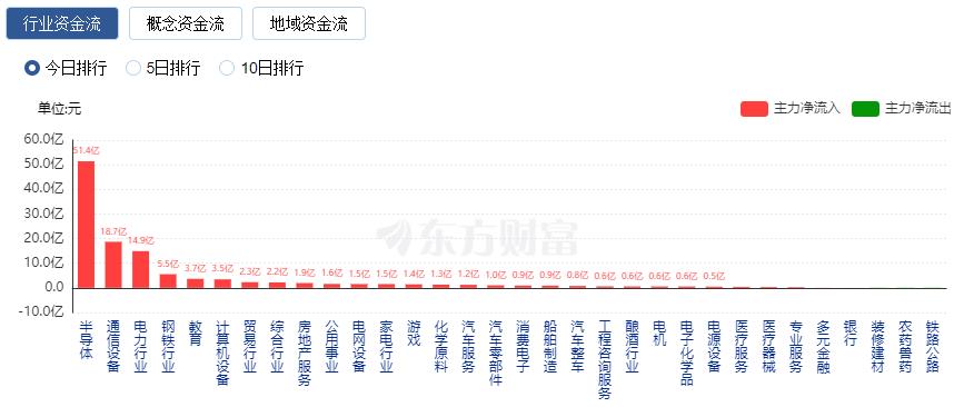 行业资金流向方面,半导体行业净流入资金高达51.40亿,位居各行业之首。而证券、软件开发等行业则出现资金净流出。