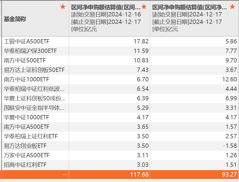据Choice数据显示,12月16日至17日,全市场825只股票ETF(剔除跨境ETF)共计净流入117.68亿元。其中,工银中证A500ETF两日净流入17.82亿元,华泰柏瑞沪深300ETF净流入11.59亿元。
