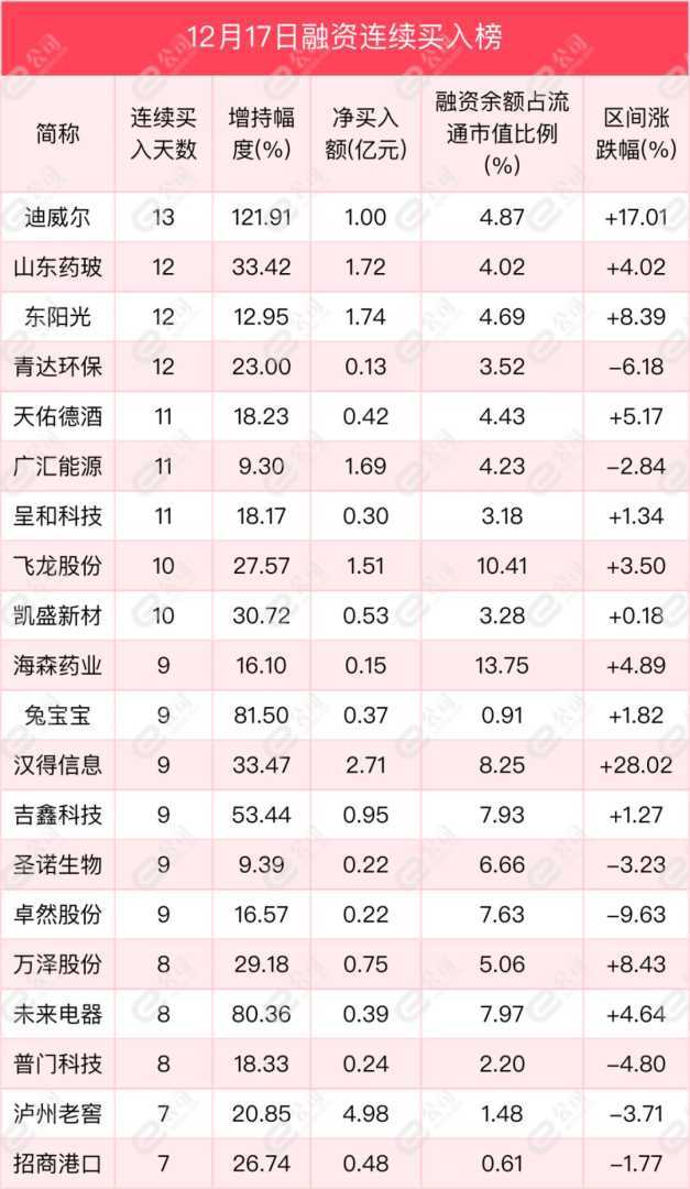 从连续买卖的角度来看,迪威尔、山东药玻和东阳光在融资连续净买入天数上位居前列,分别为13天、12天和12天。期间,它们的净买入额分别为1亿元、1.72亿元和1.74亿元,增持幅度分别为121.91%、33.42%和12.95%。