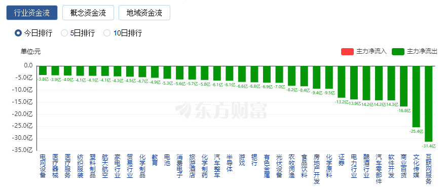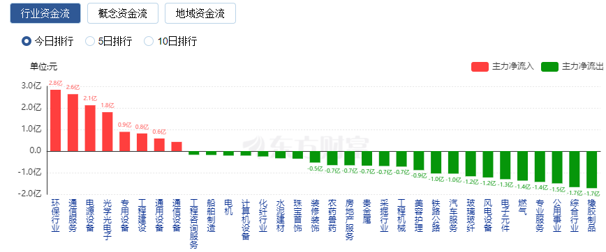 从行业资金流向来看,环保、通信等行业资金净流入排名靠前,其中环保行业净流入达到2.8亿元。而在净流出方面,互联网服务、文化传媒等行业排名靠前,其中互联网服务行业资金净流出达到31.4亿元。