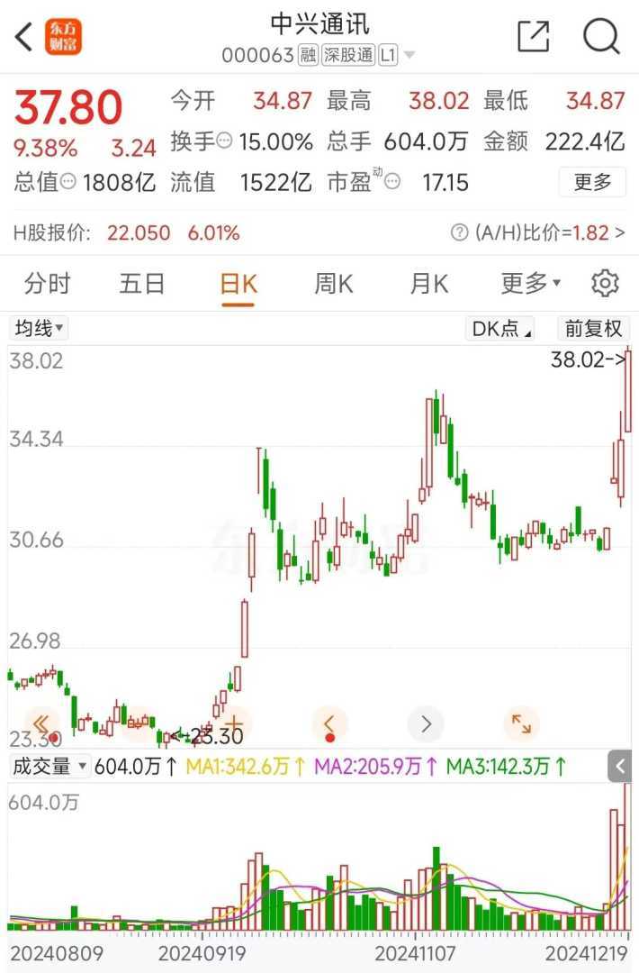 通信设备板块的中兴通讯周四高开高走,一度触及涨停,最终收盘大涨9.38%。近四个交易日,中兴通讯连续收阳,累计涨幅高达23.73%,市值已攀升至1808亿元。周四当天,中兴通讯成交额高达222.41亿元,创下自1997年上市以来的历史新高。此外,中兴通讯已连续三个交易日成为A股成交额最高的个股。