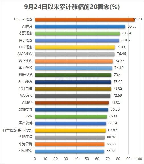 周四,科技股成为A股市场的绝对主角。A股成交额前20的个股中,科技股占据了16席。从行业细分来看,电子行业有8只个股上榜,计算机行业有6只,通信行业有2只。从更长的时间周期来看,自9月24日以来,Chiplet概念表现最为强势,累计涨幅达95.73%。AI芯片紧随其后,累计涨幅达86.55%。EDR概念、AIGC概念、Sora概念等也位居概念涨幅榜前列。