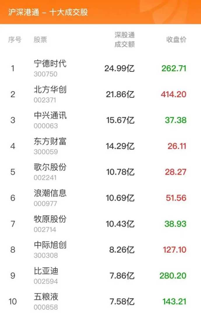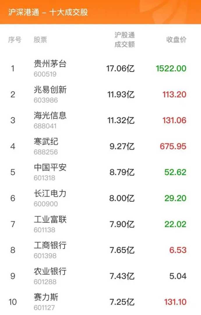 沪深港通十大成交股数据显示,贵州茅台、兆易创新、海光信息在沪股通中排名前三,成交额分别为17.06亿元、11.93亿元和11.32亿元;而宁德时代、北方华创、中兴通讯则位列深股通前三,成交额分别为24.99亿元、21.86亿元和15.67亿元。
