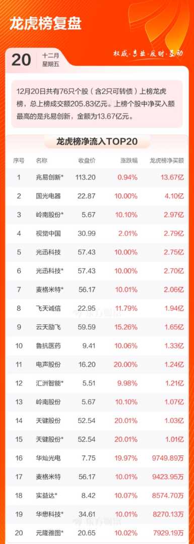 12月20日,共有76只个股(含2只可转债)上榜龙虎榜,总上榜成交额达到205.83亿元。其中,兆易创新以13.67亿元的净买入额位居榜首。