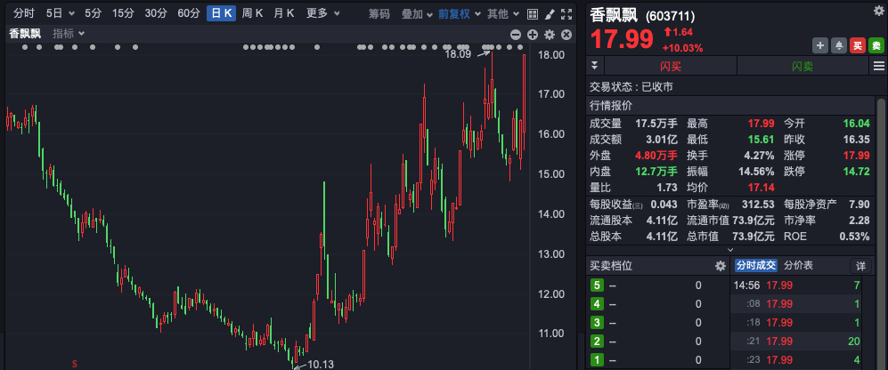 食品饮料板块午后也呈现拉升态势,香飘飘涨停,来伊份等个股涨幅居前。香飘飘表示,第四季度奶茶业务处于销售旺季,公司正在全力做好运营工作。