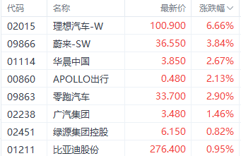港股汽车股在11月销量延续亮眼表现的推动下,整体呈现上涨态势。具体来看,理想汽车-W(02015.HK)、蔚来-SW(09866.HK)、华晨中国(01114.HK)分别实现了6.66%、3.84%、2.67%的涨幅。这一市场表现反映了投资者对汽车股未来前景的乐观预期。
