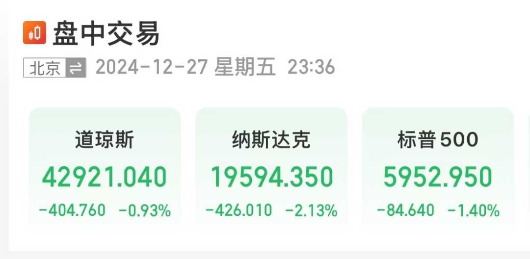 北京时间12月27日晚间,美股市场遭遇寒流,三大指数集体低开并维持弱势震荡。截至最新数据,道琼斯工业平均指数下滑超过400点,跌幅达到0.93%;纳斯达克综合指数则大幅下跌2.13%;标准普尔500指数同样未能幸免,下跌1.40%。