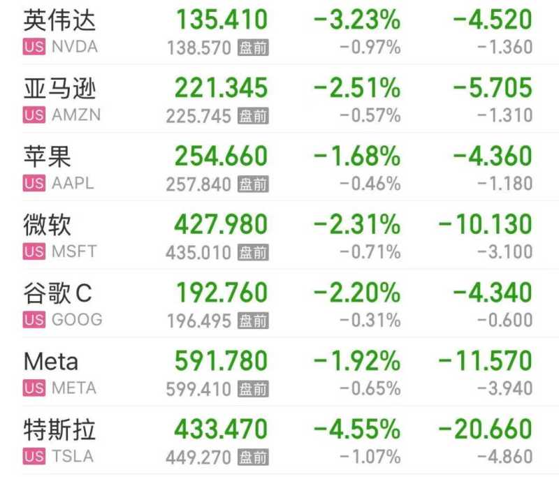 在科技板块,大型科技股普遍遭遇抛售压力。其中,电动汽车巨头特斯拉领跌,股价下跌4.55%,市值因此蒸发高达663.19亿美元(相当于人民币4839.93亿元)。此外,英伟达、亚马逊、微软、谷歌等科技巨头也纷纷走低,跌幅均超过2%。苹果与Meta虽然跌幅相对较小,但也超过了1%。