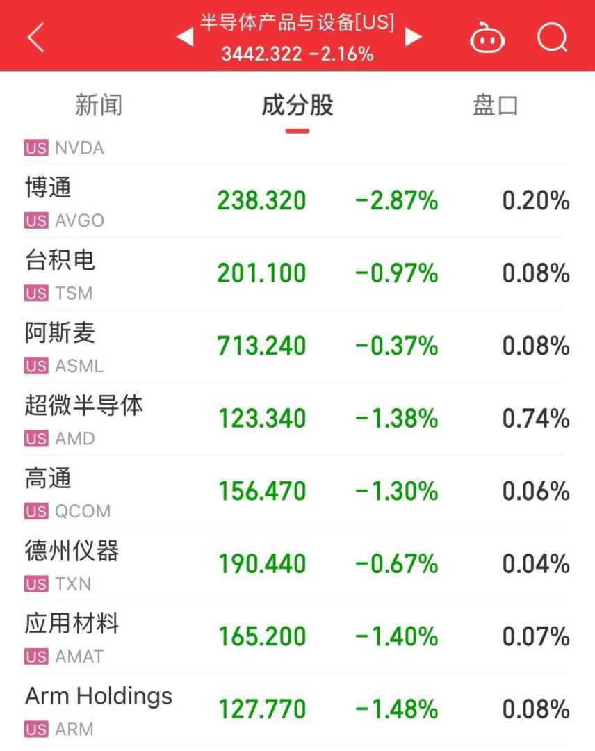 半导体行业同样承压,多数芯片股出现下跌。博通跌幅超过2%,AMD、高通、应用材料等知名芯片制造商也均下跌超过1%,而台积电则微跌近1%。