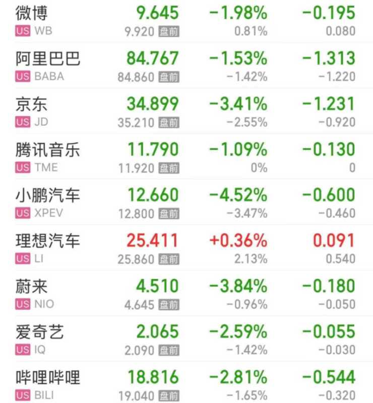 中概股方面,整体表现同样不佳。纳斯达克中国金龙指数下跌1.61%,其中小鹏汽车跌幅超过4%,蔚来汽车与京东则下跌超过3%。爱奇艺与哔哩哔哩也均下跌超过2%,阿里巴巴与微博同样走低,跌幅超过1%。值得注意的是,理想汽车逆势上涨0.36%,成为少数上涨的中概股之一。