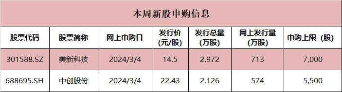 本周(3月4日—3月8日),创业板的美新科技和科创板的中创股份将相继开启新股申购。美新科技专注于新型环保塑木型材的研发、生产和销售,产品包括户外地板、墙板等,广泛应用于家庭院落阳台及公用建筑设施等户外环境。而中创股份则是国内领先的基础软件中间件产品与服务提供商,其服务范围覆盖党政、军工、金融等多个行业。