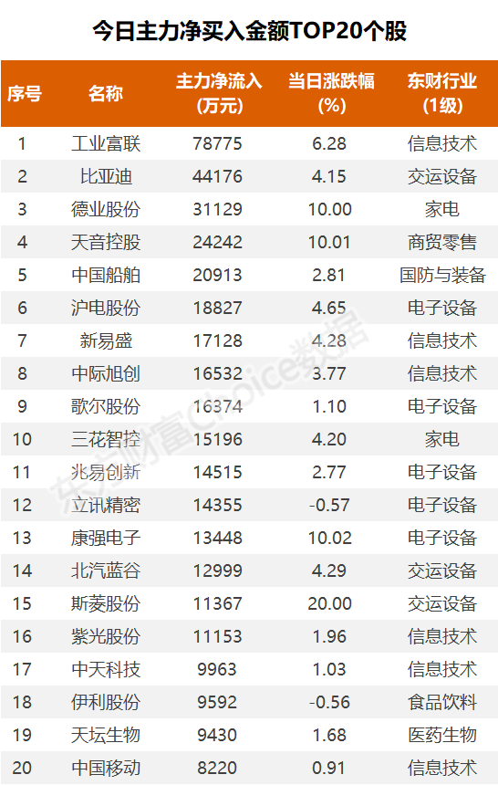 具体到个股层面,东方财富Choice数据显示,6月13日主力净买入金额排名前20的个股中,工业富联以7.88亿元的净买入额高居榜首,当日股价大涨超6%;紧随其后的是比亚迪,主力净买入4.42亿元。